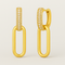 Each earring features two interlocking oval links: one gracefully polished in rich yellow gold, the other illuminated by a pavé of 74 round white diamonds totaling 0.24 carats. The sleek, elongated silhouette frames the face beautifully, offering just the right amount of movement and sparkle.